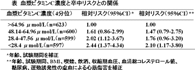 | 血漿ビタミンC濃度が低い群、その中でも特に高血圧者と過体重者において卒中のリスク高かった。 |